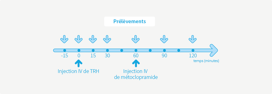- Prélèvements (tubes secs ou tubes EDTA) aux temps T+15, T+30 et T+60 min après l’injection de TRH.