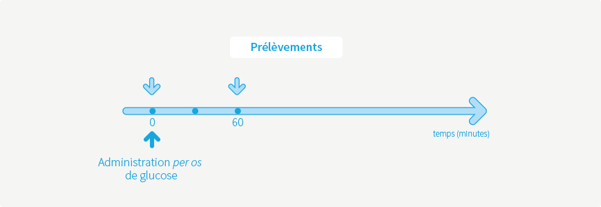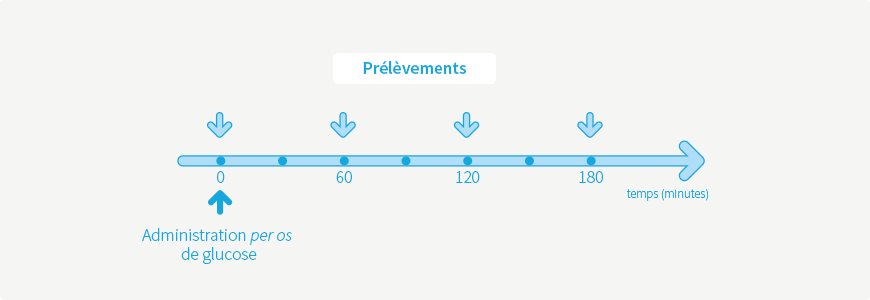 - Prélèvements (tubes fluorés ou iodo-acétate) aux temps T+60, T+120 et T+180 min.